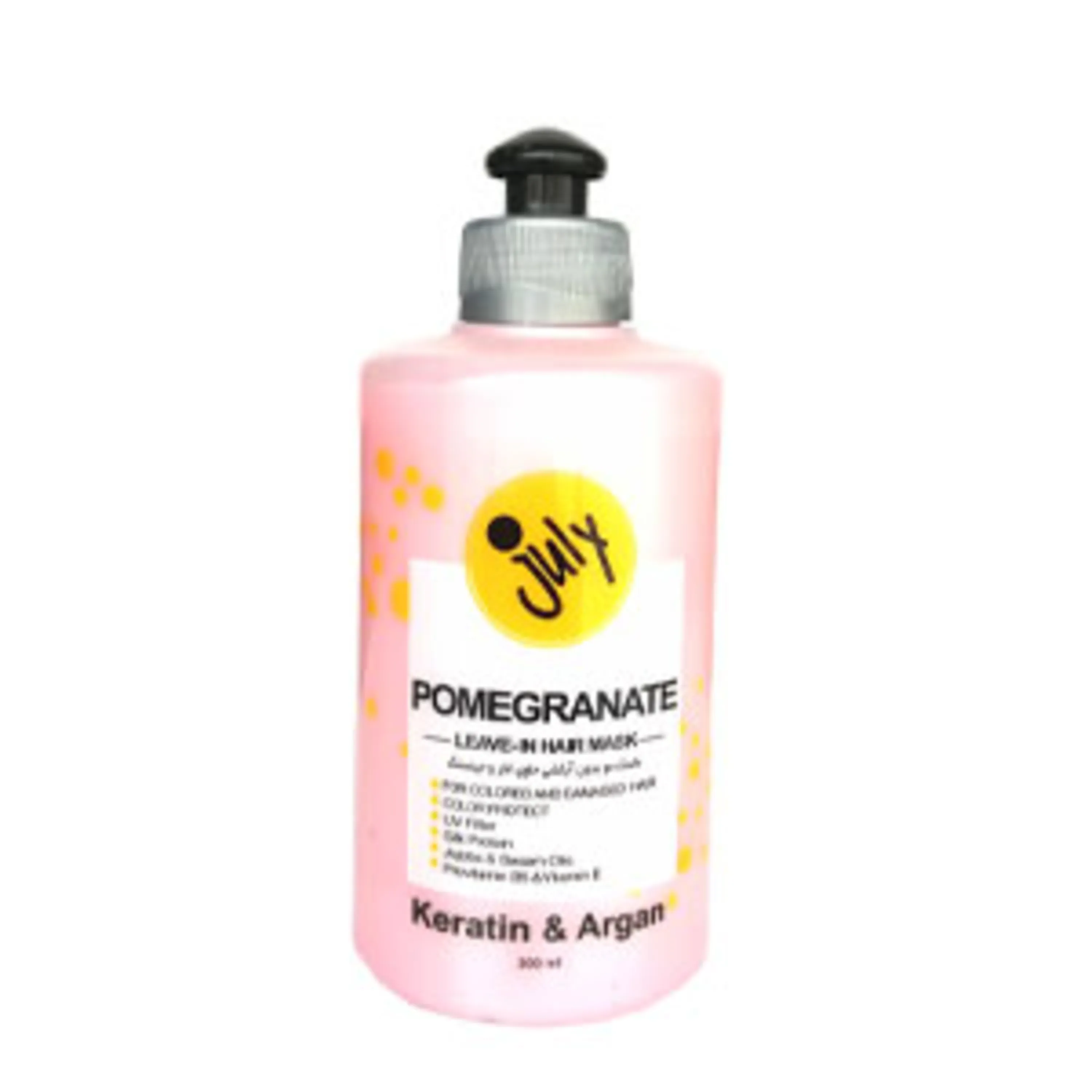 ماسک مو بدون آبکشی حاوی انار و جینسنگ تثبیت کننده رنگ مو مناسب موهای رنگ شدهjuly pomegranate leave in hair mask keratin and argan